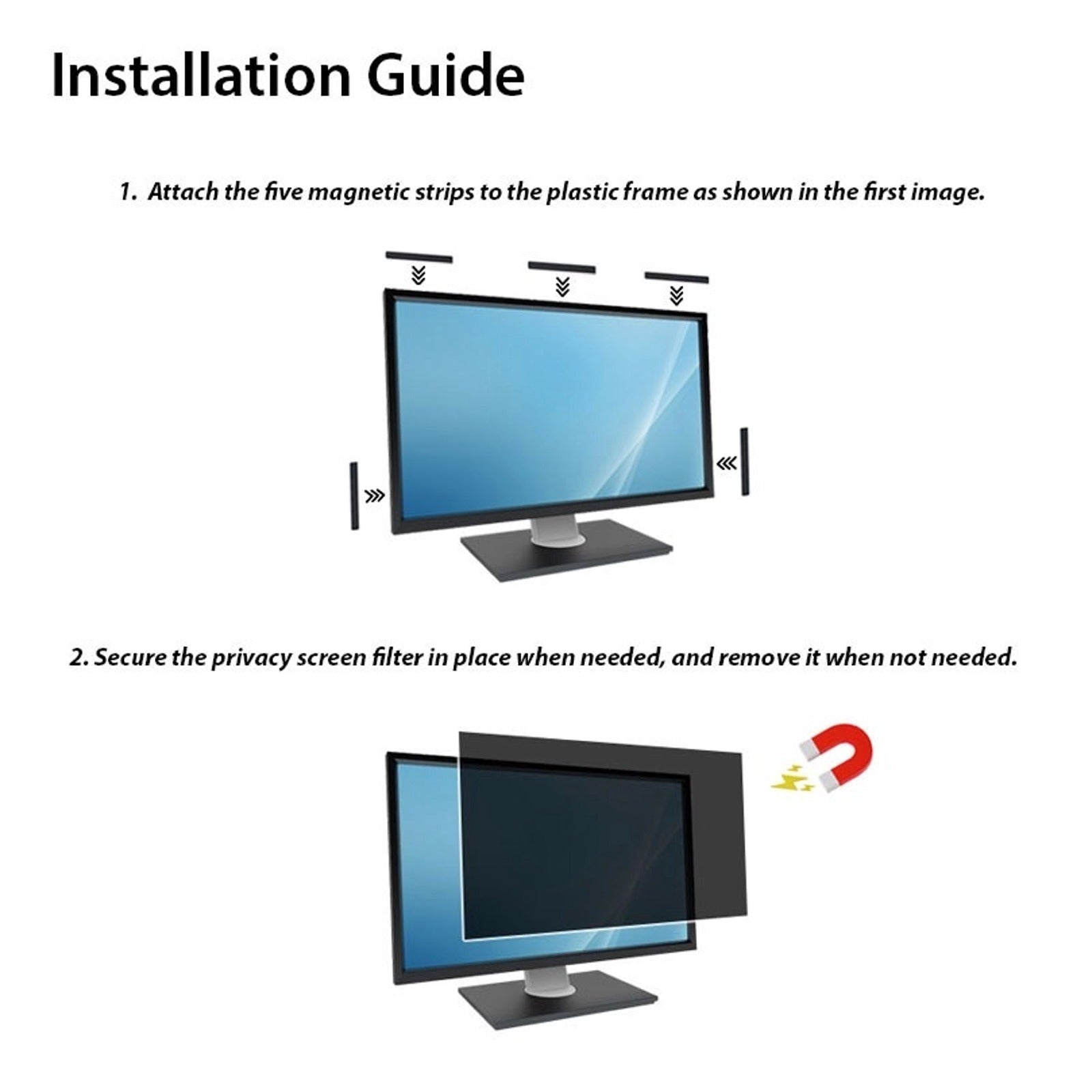 | Installation Guide | Attach magnetic strips to screen edges, align filter, and snap on |