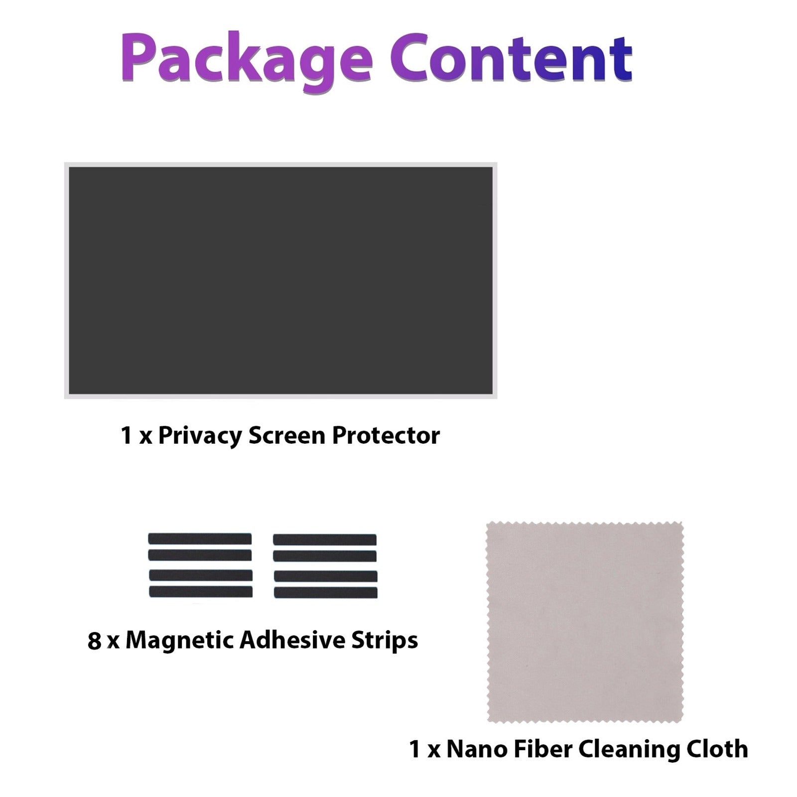 | Package Includes | 1 × Privacy Screen Protector, 8 × Magnetic Adhesive Strips, 1 × Nano Fiber Cleaning Cloth |